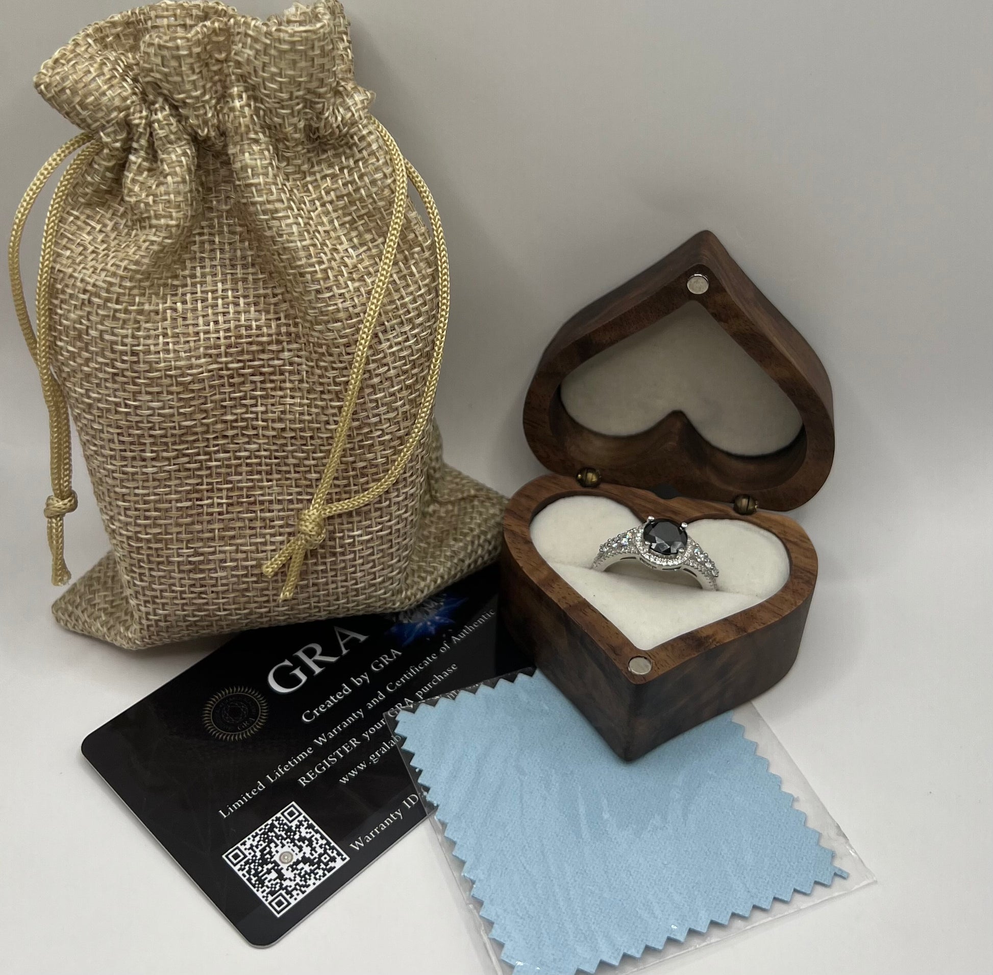Shop the Certified 2Ct Black Moissanite Diamond Ring for men, crafted from solid 925 sterling silver. Perfect for proposals, engagements, weddings, anniversaries, birthdays, and Christmas. Includes free box engraving, gift box, gift sack, cleaning cloth, and paperwork. Free shipping available.